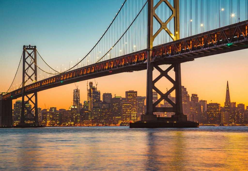 As the sun gracefully sets over the majestic Golden Gate Bridge, set sail on a picturesque twilight cruise across the iconic San Francisco Bay. The city's skyline, adorned by the shimmering lights of the Bay Bridge and the Golden Gate Bridge, alongside the historic charm of Alcatraz Island, forms a breathtaking tableau that flawlessly captures the essence of its beauty.